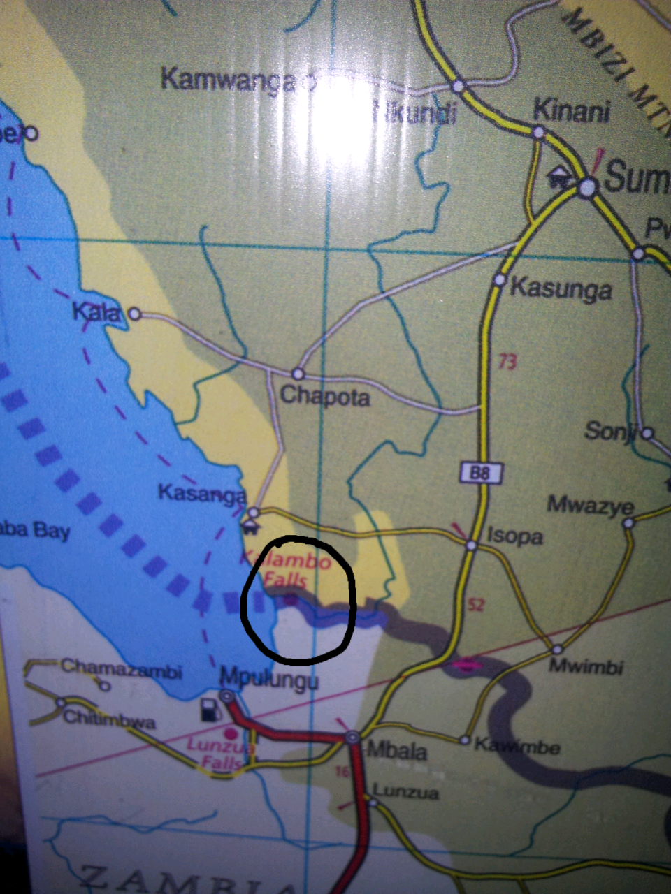 Ni kwenye eneo lililozungushiwa kiduara cheusi, hapo ndipo maporomoko ya Kalambo yalipo. Yapo mpakani kabisa kati ya Tanzania na Zambia. Kwa upande wa Tanzania yapo mkoa wa Rukwa, Karibu na Kijiji cha Kasanga ambao upo pembezini ya Ziwa Tanganyika. Sumbawanga ni ndio mji mkubwa ambao maporomoko haya yapo karibu nao. Kasanga ni moja ya vijiji ambavyo meli Kongwe Duniani inayofanya kazi mpaka sasa ya Mv. Liemba husimama. Picha juu nimeipiga kutoka kwenye moja ya Ramani za Tanzania. Unaweza kufuatilia mwenyewe kwenye Google Maps kama inavyoonekana hapa chini japo eneo yaliyopo maporomoko haya halijakuwa tagged sawasawa.